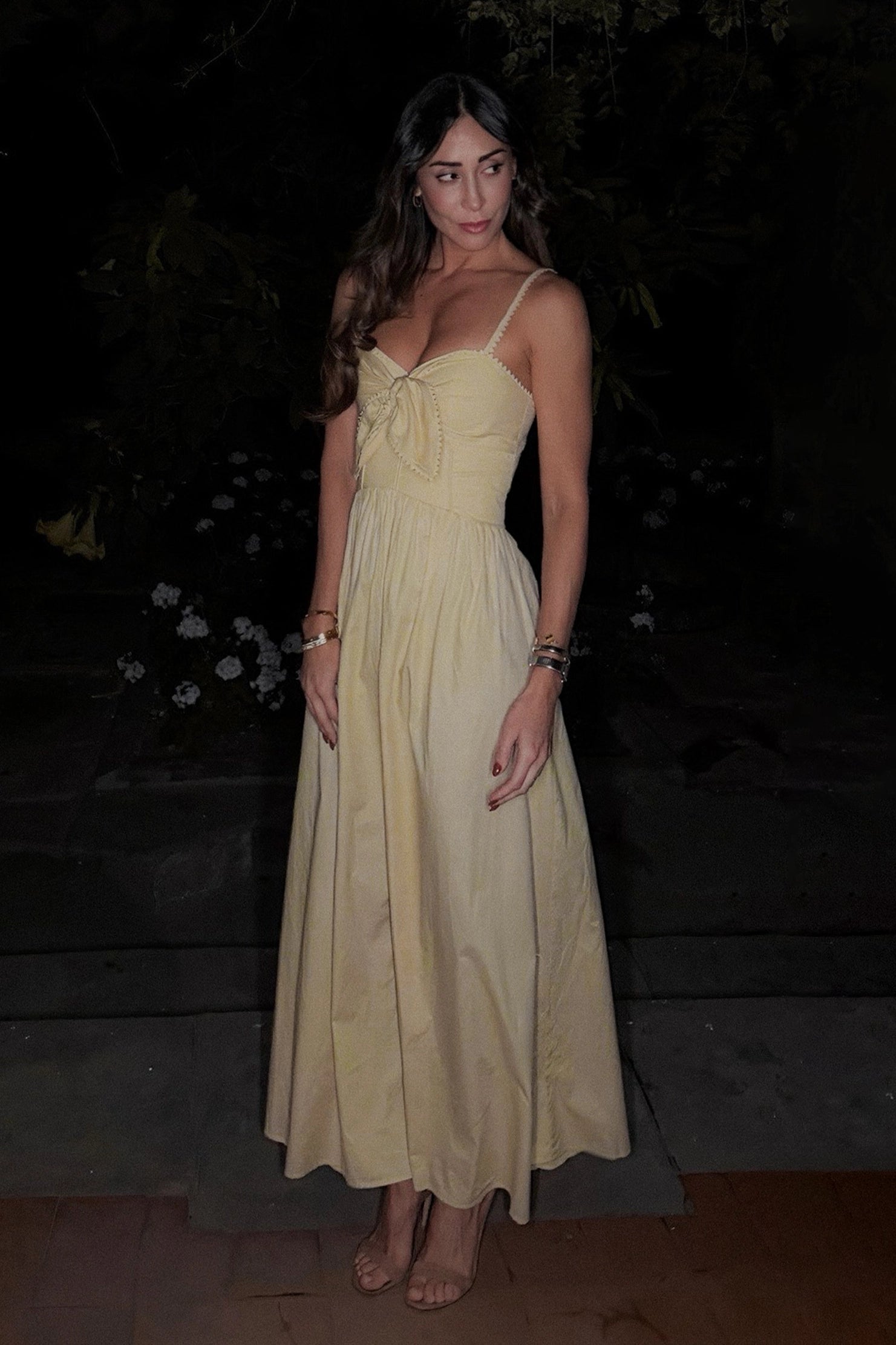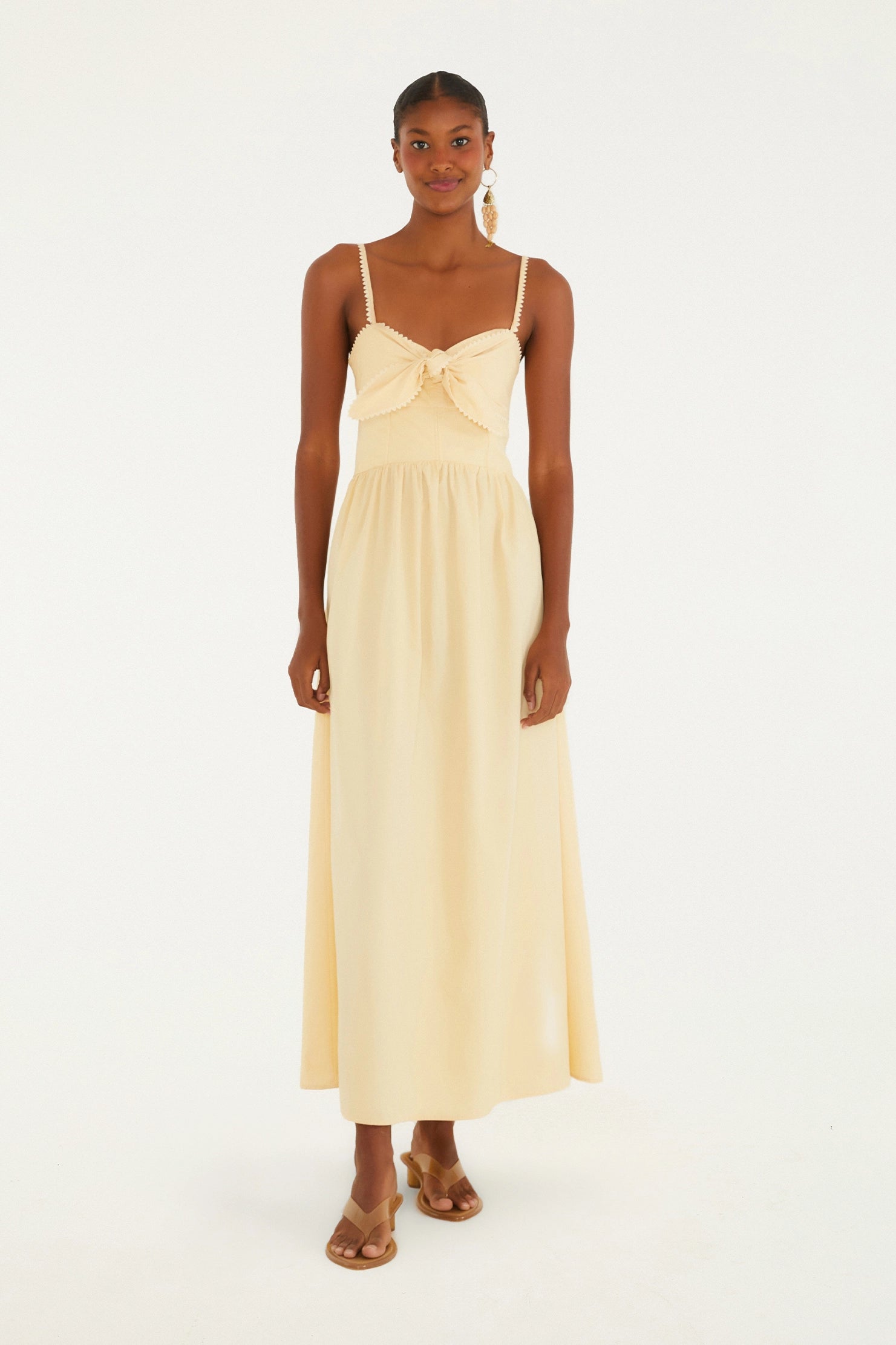 Vestido de tirantes con lazo frontal. Con escote en V y delicados tirantes ajustables, su encanto reside en el detalle del lazo frontal que proporciona un ajuste perfecto e informal. Confeccionado en tejido ligero, es ideal para momentos relajados, ya sea un paseo al aire libre o una cita especial.