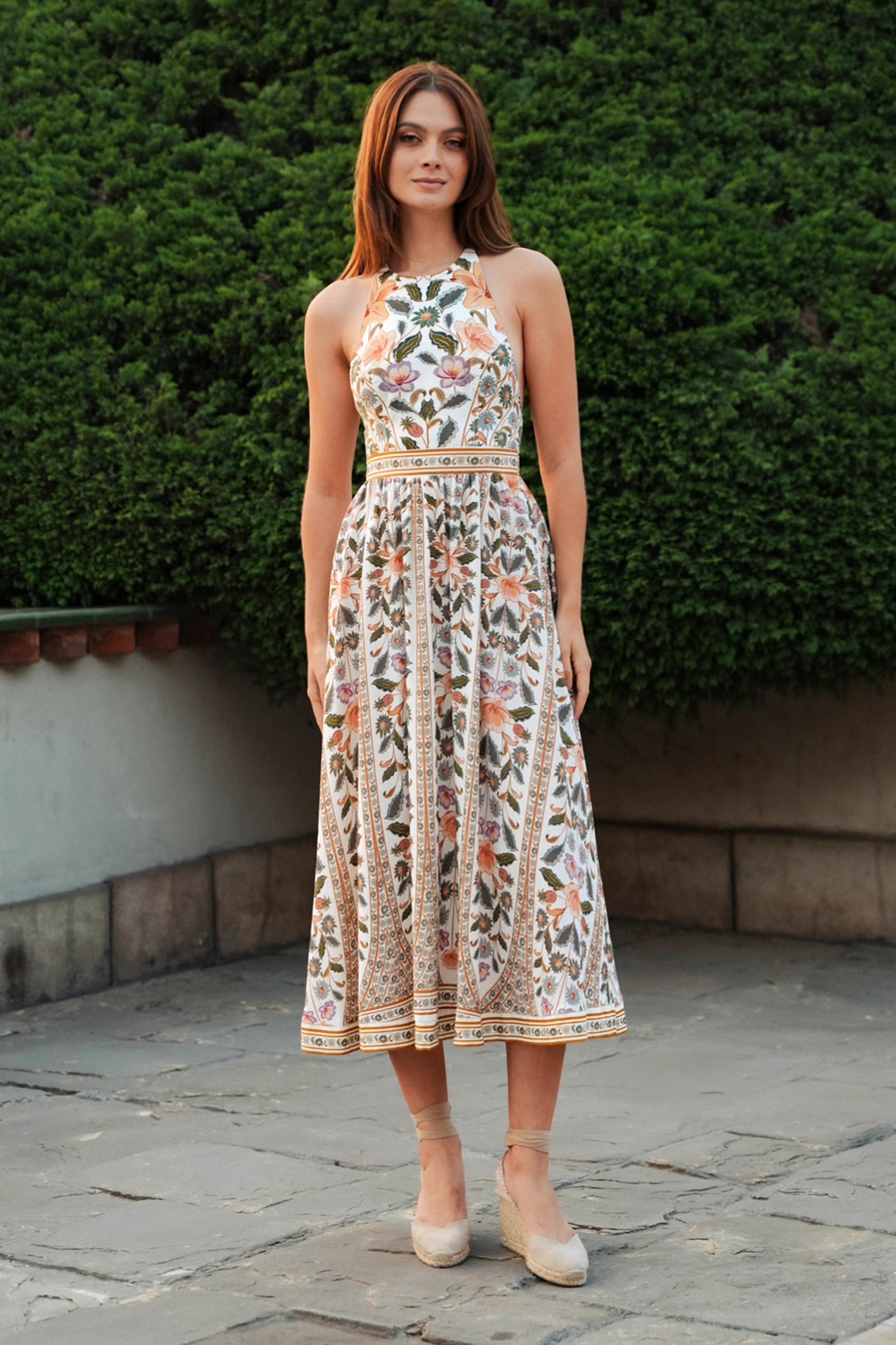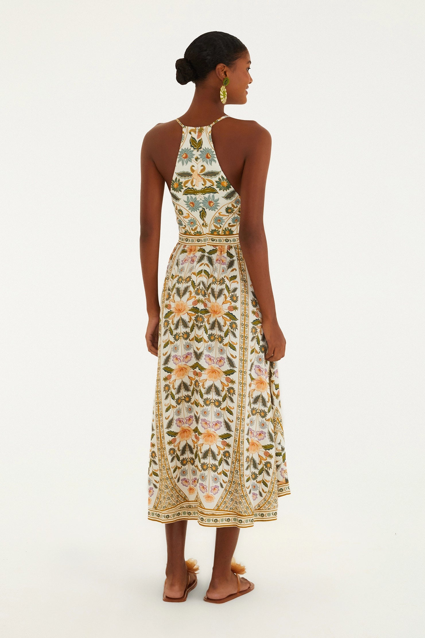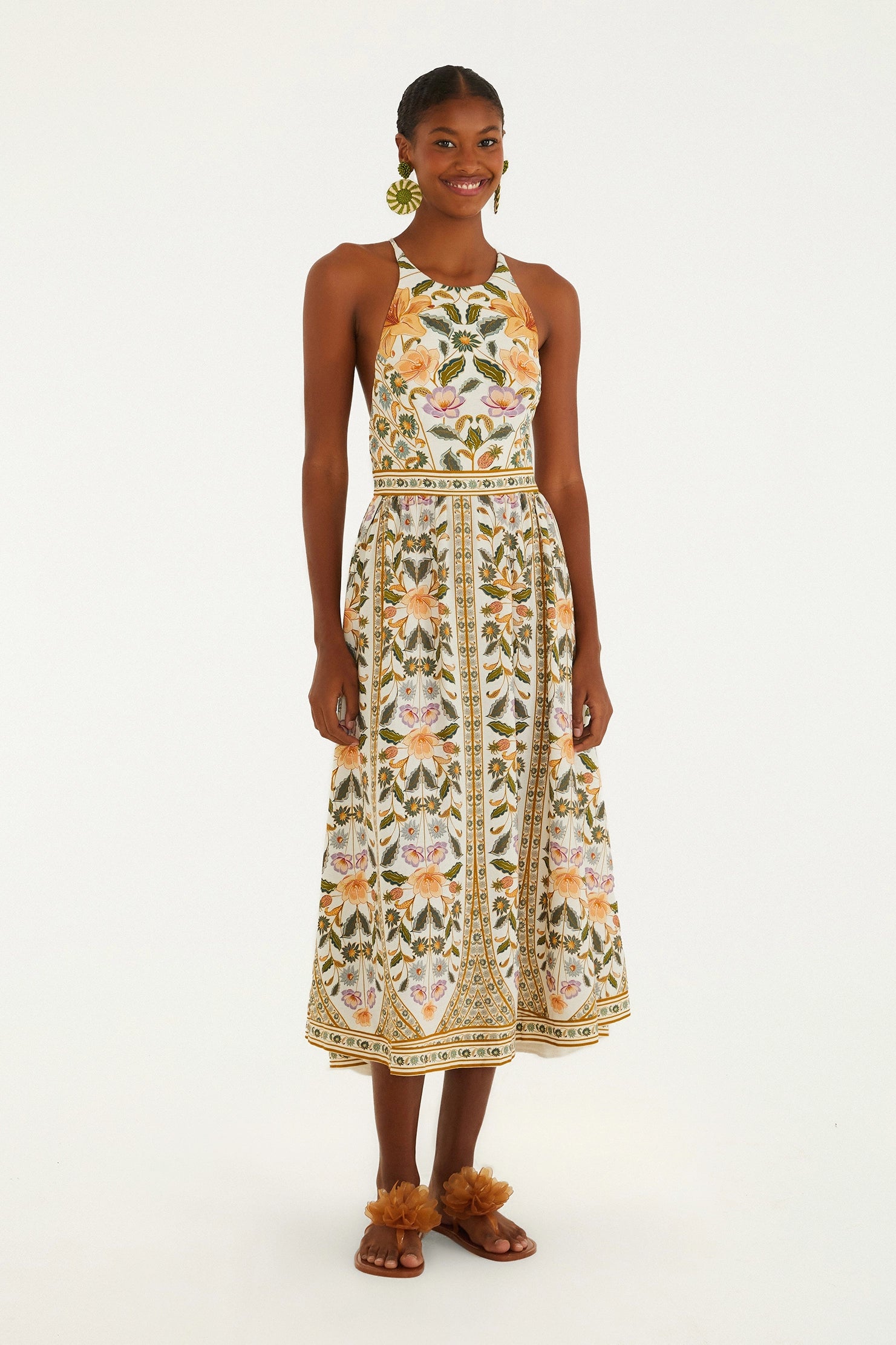 Vestido largo sin mangas Marcelle con estampado. Escote halter que realza los hombros, tirantes finos ajustables y falda fluida con una caída ligera. Sus delicados acabados y su estampado exclusivo lo convierten en la prenda ideal para una salida informal o un evento especial. Una pieza que combina comodidad y originalidad a la perfección.