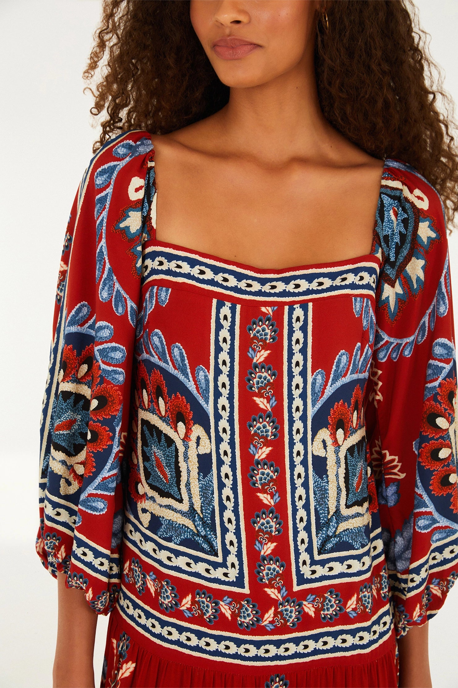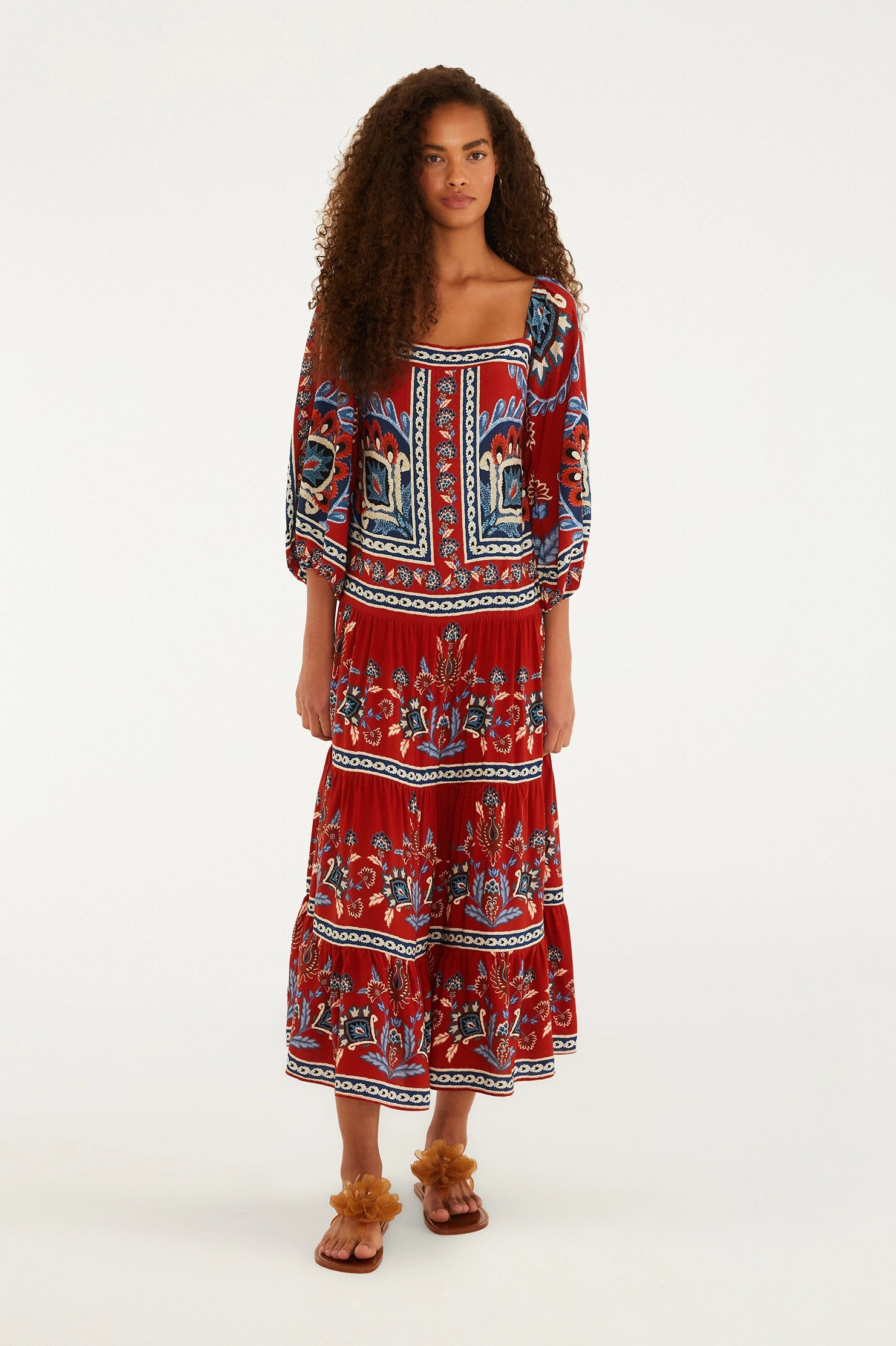 Vestido largo con estampado de pañuelo náutico y mangas abullonadas. Con escote cuadrado y mangas abullonadas, es ideal para un paseo informal junto al mar o una cena al aire libre. Su corte holgado ofrece comodidad, mientras que los detalles de capas le dan un toque único. Perfecto para quienes buscan personalidad en cada detalle.
