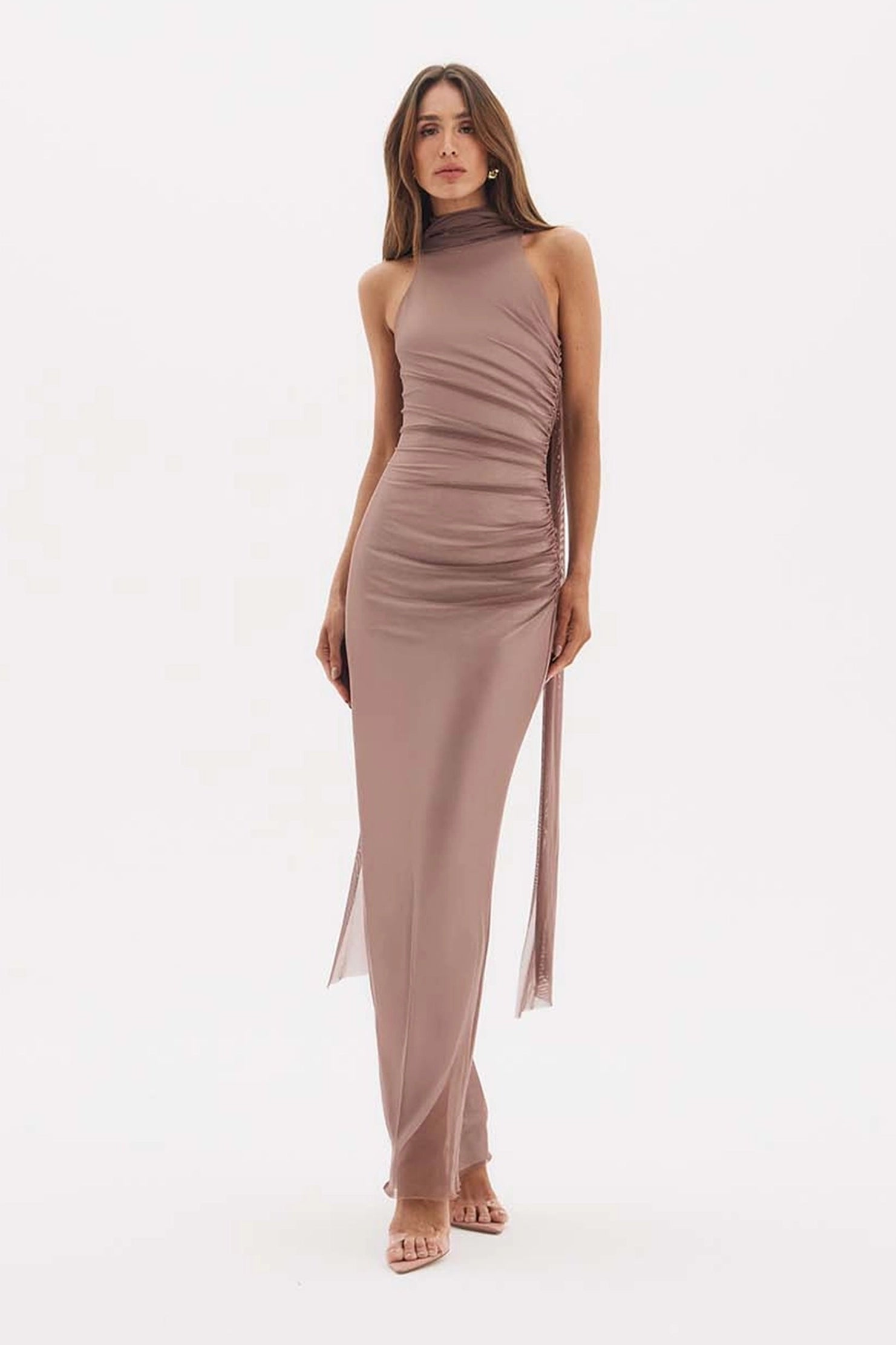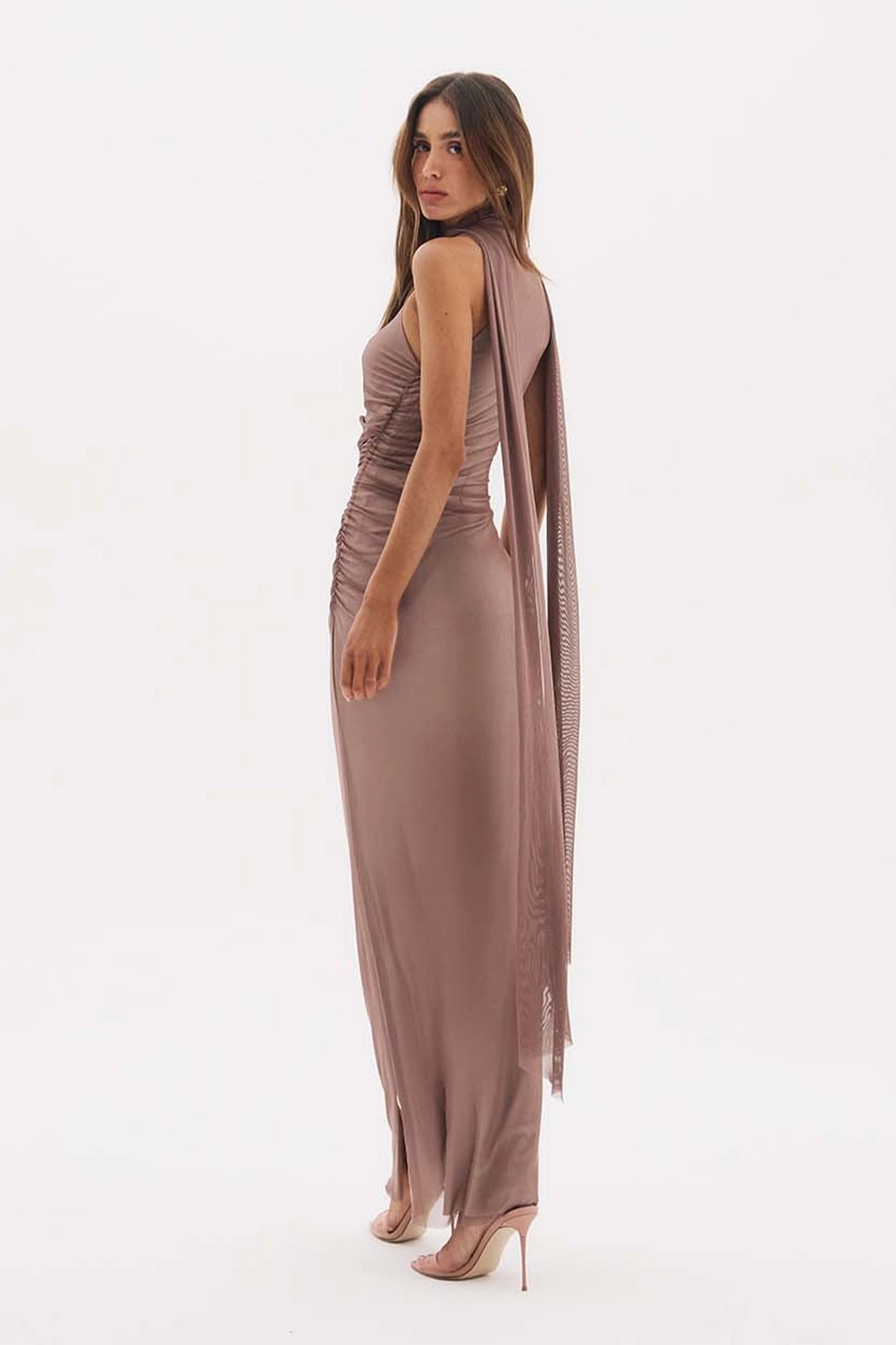 Vestido con diseño ajustado que se adapta a las curvas, con un drapeado estratégico concentrado en los laterales que crea volumen y textura, extendiéndose hasta una larga banda de tul fluido. El diseño asimétrico crea un look escultural y moderno.